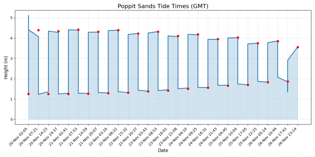 All times are in GMT. Graph below shows tide heights for the next 7 days.