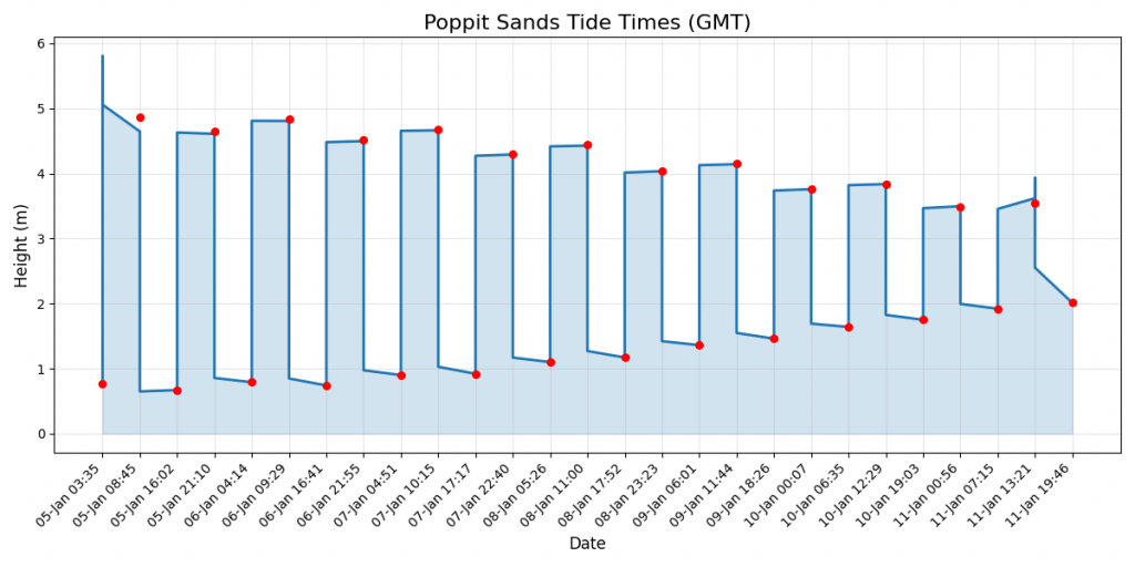 All times are in GMT. Graph below shows tide heights for the next 7 days.