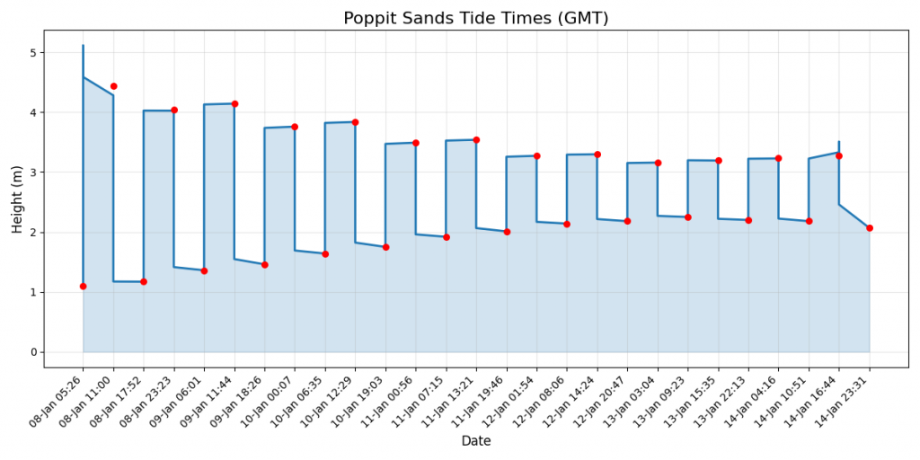 All times are in GMT. Graph below shows tide heights for the next 7 days.