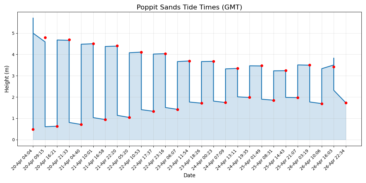 All times are in GMT. Graph below shows tide heights for the next 7 days.
